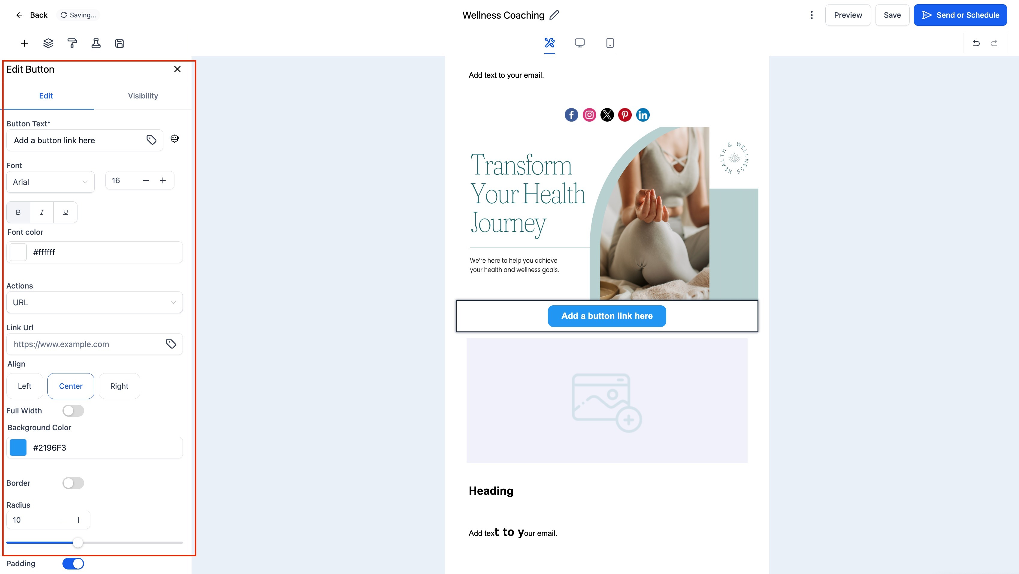 Note: Buttons are built using HTML and render reliably in most email clients. Always preview your design on both desktop and mobile to ensure proper display.