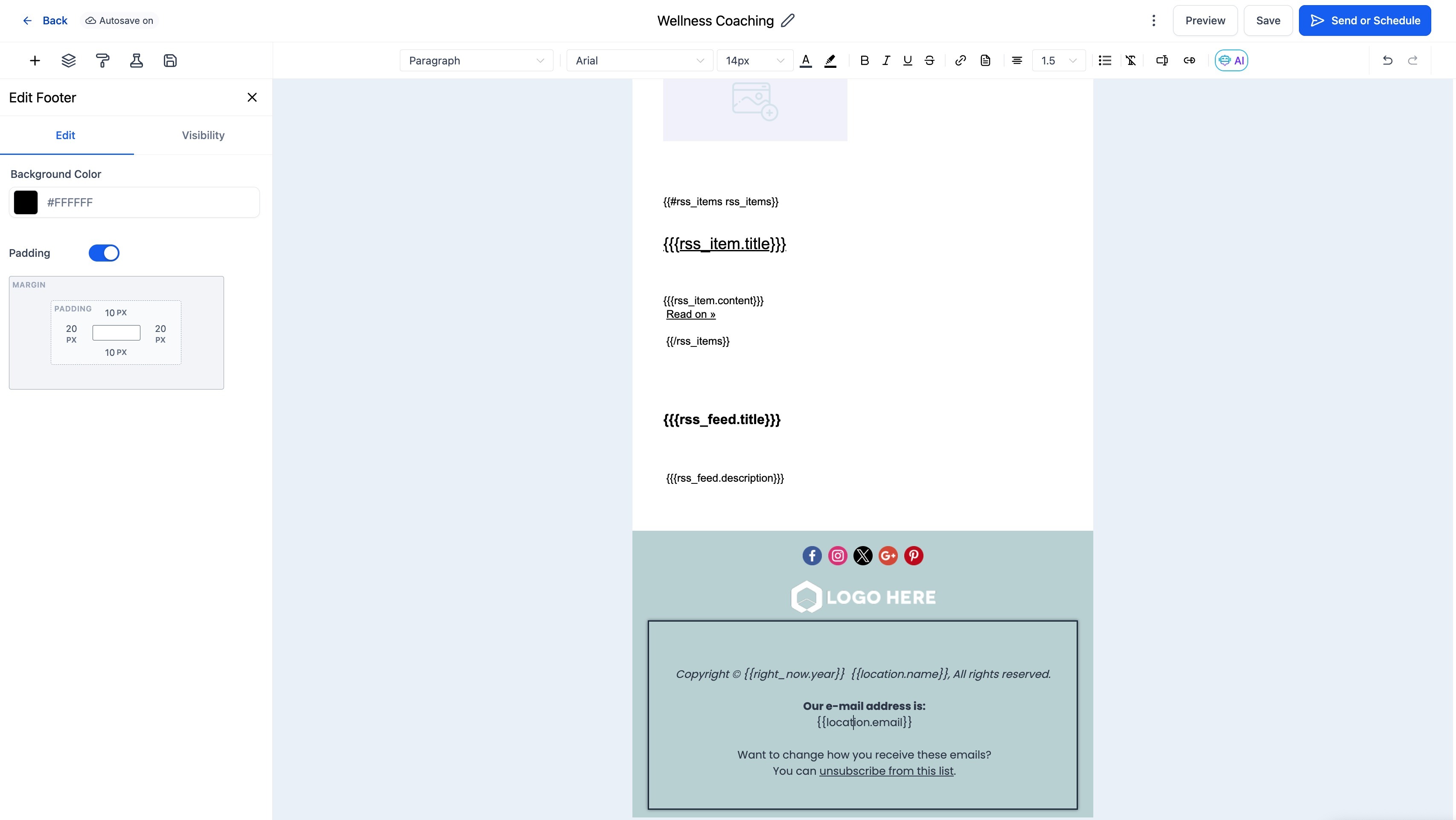 Follow these steps to add and configure the Footer Element in your email template: