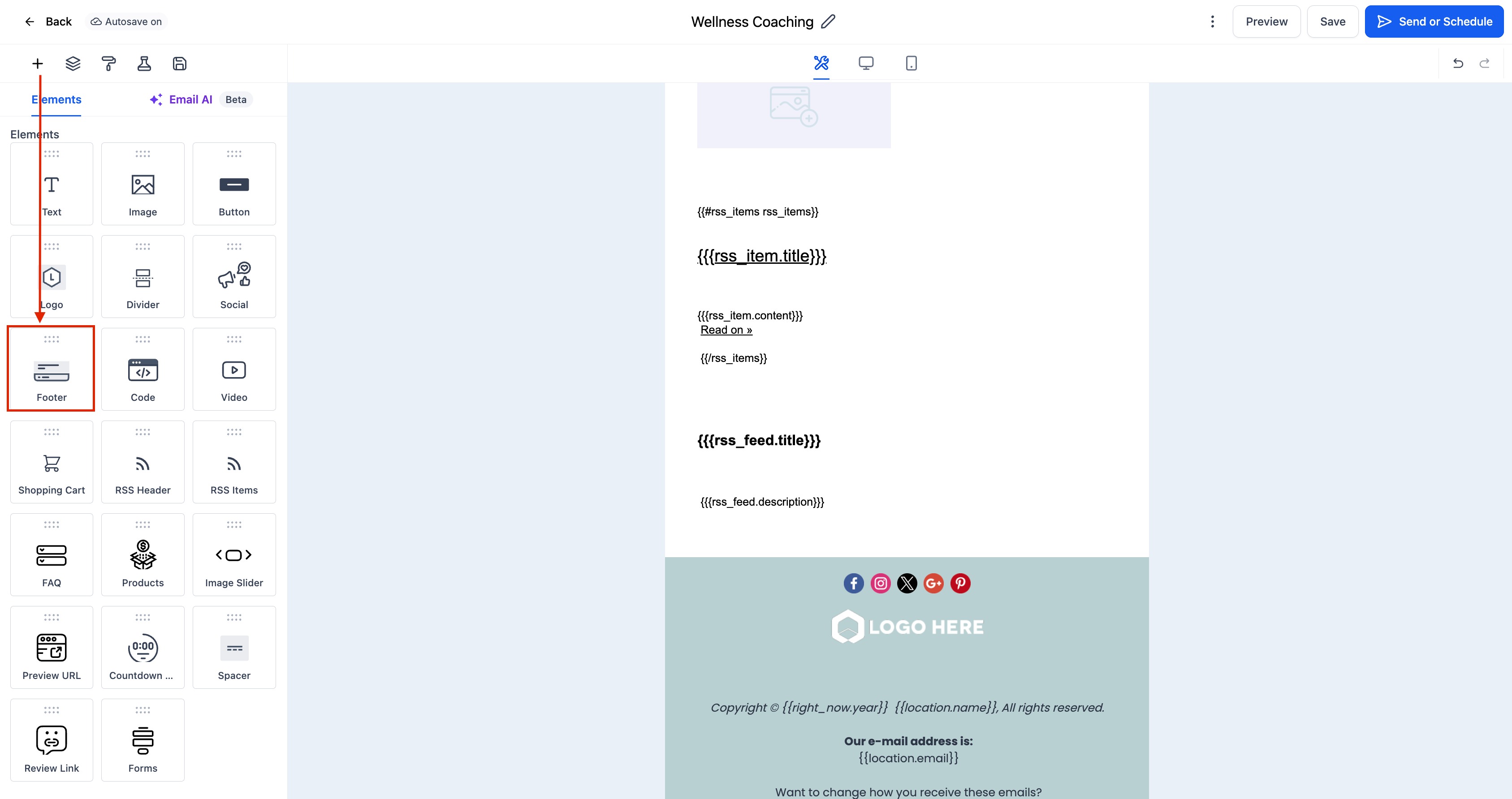 Drag and drop the Footer Element to the bottom of your email layout.