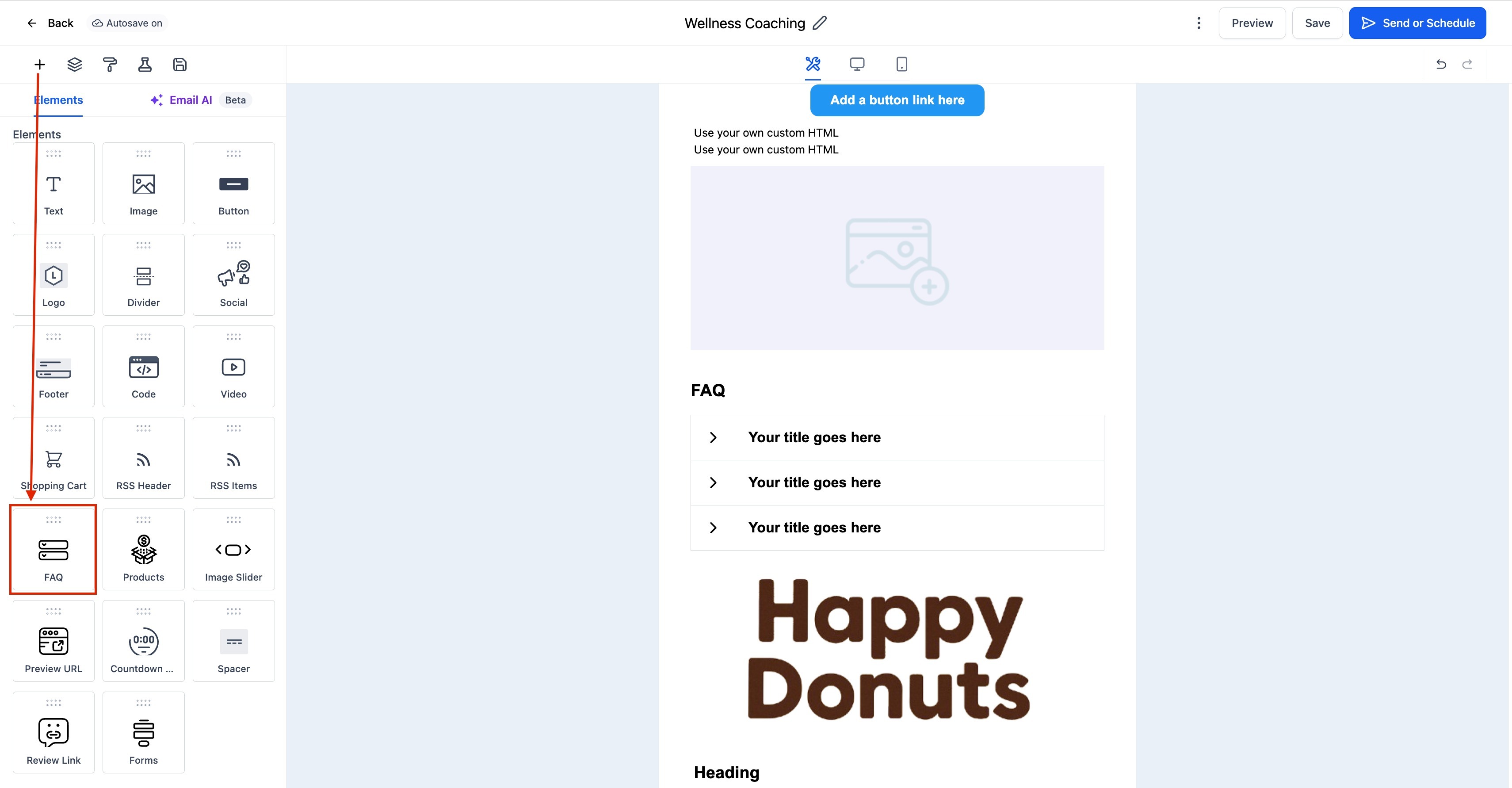 Drag and drop the FAQ Element into your desired section of the email layout.
