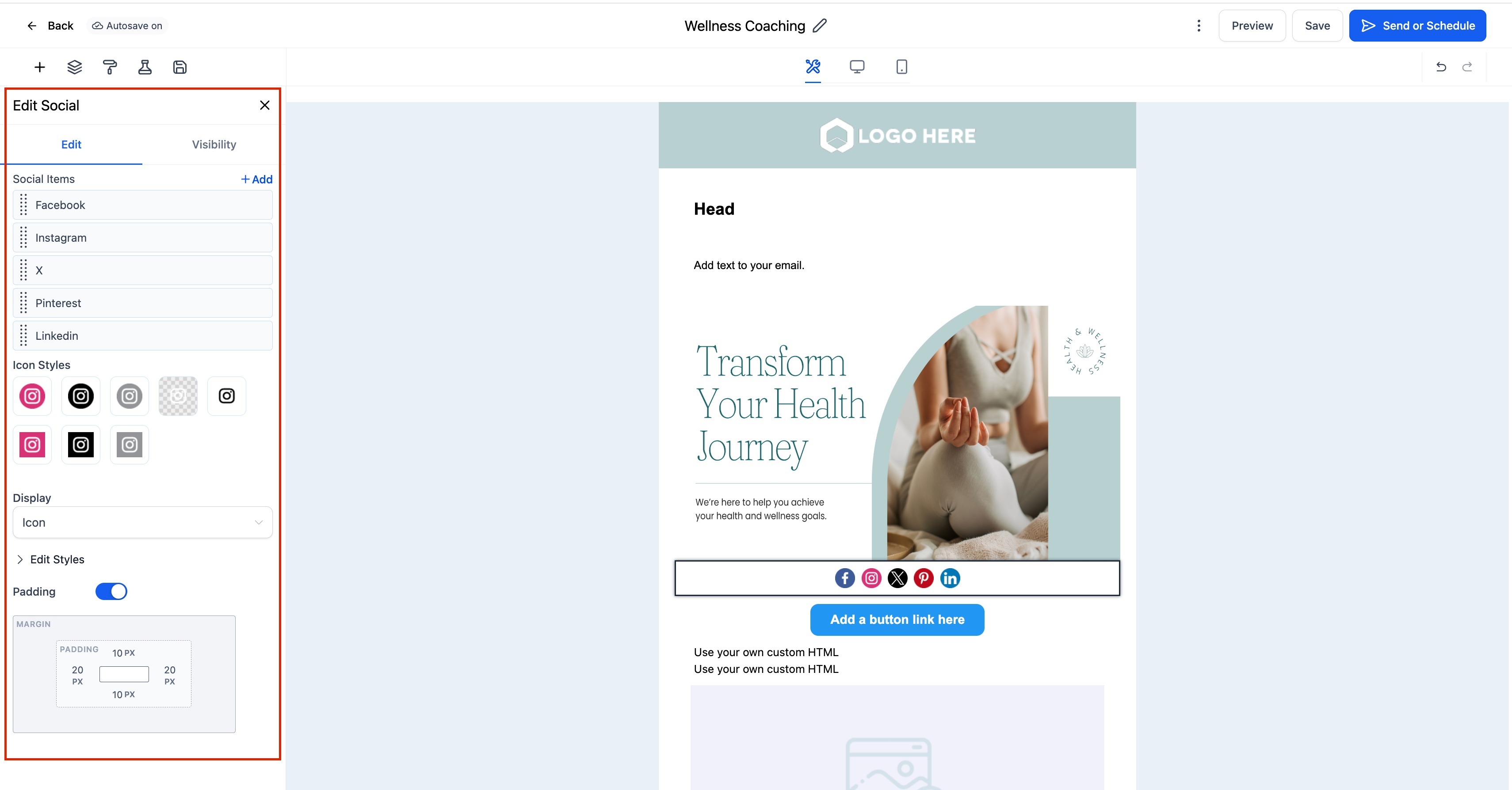 You can customise icon style, colour, size, and alignment to ensure the social section matches your email’s overall design and brand identity.