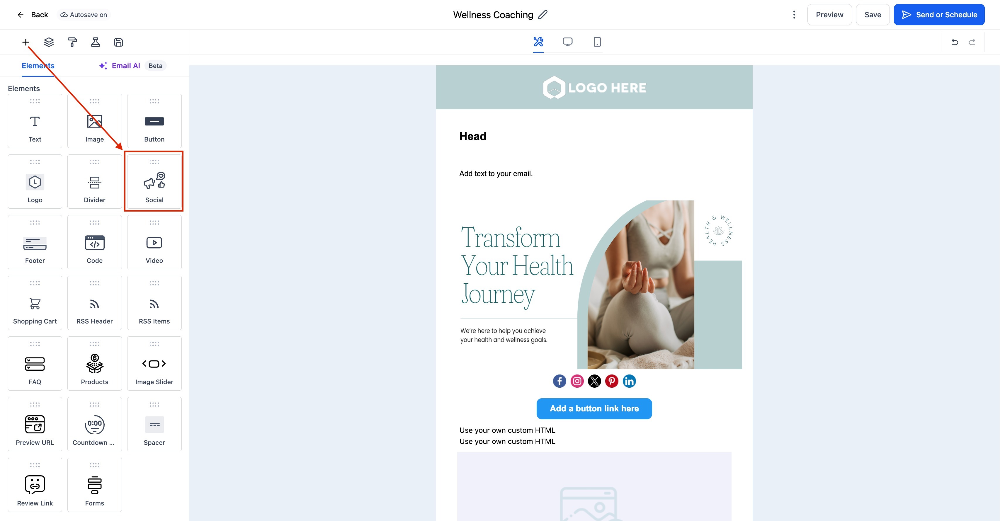 Follow these steps to add and configure the Social Element in your email template: