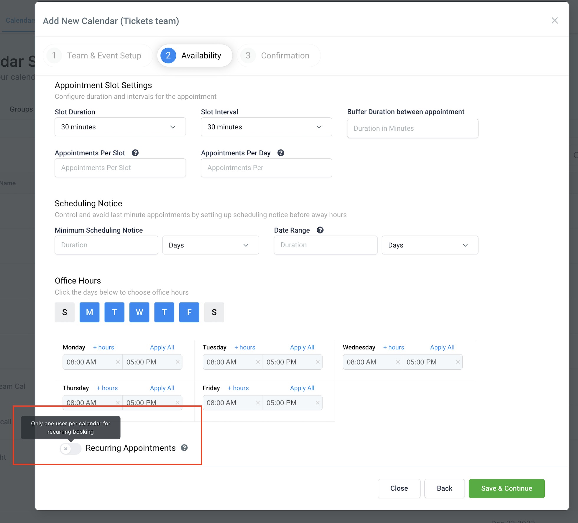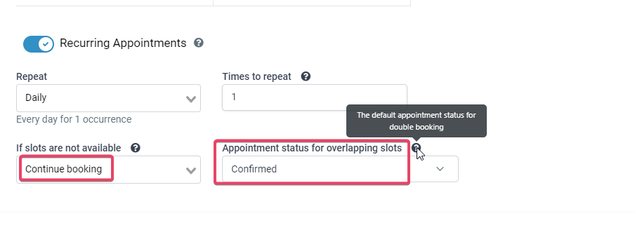 Once you toggle on the Recurring Appointments, you can see the recurring appointments settings, and you can select the settings based on your use case.