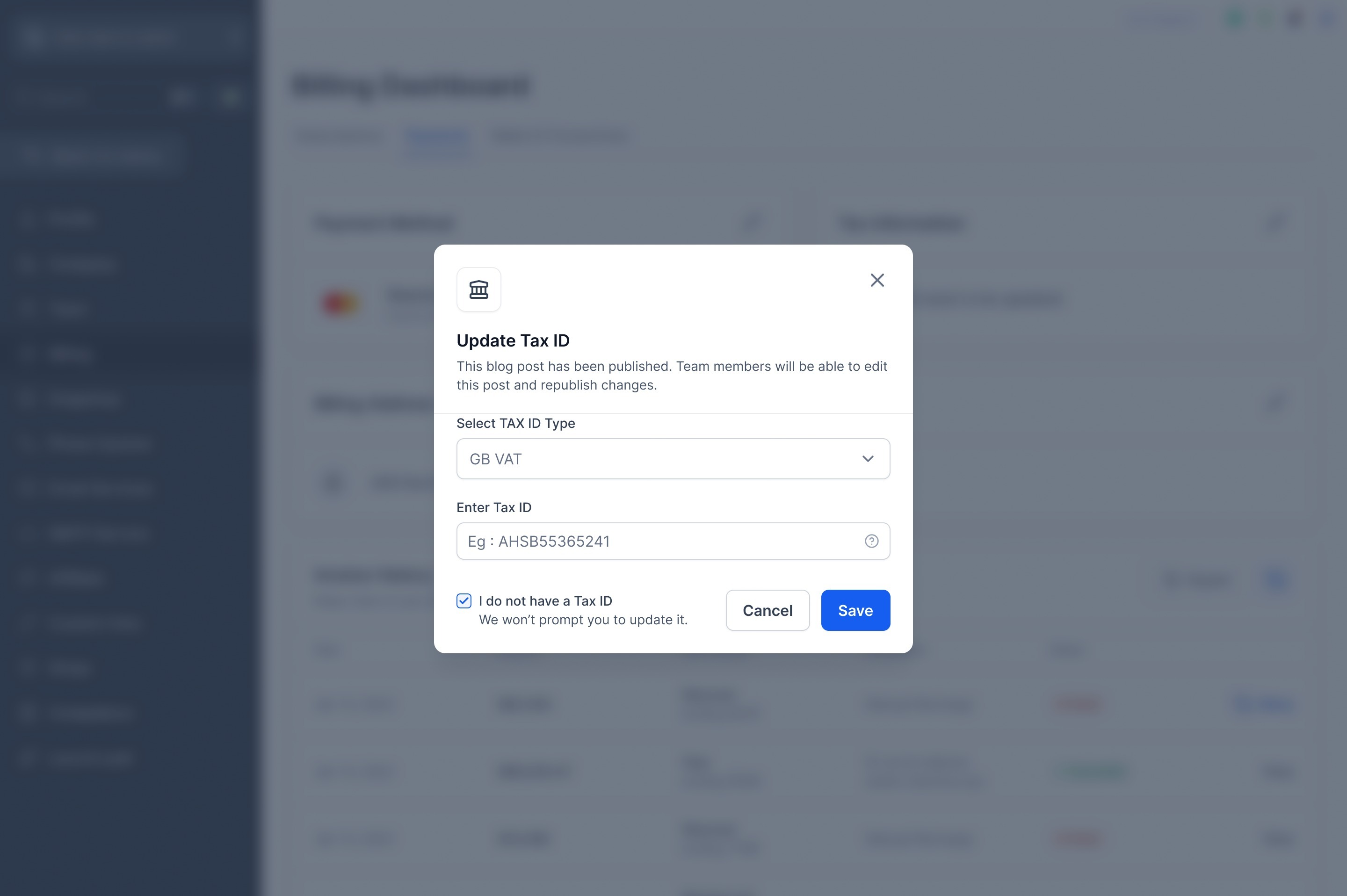We support all Tax ID types that are used across the globe. Though the Tax ID Type options are at a regional level, and you need to know the correct region of your Tax ID registration to be able to update the Tax information without any roadblocks. Once the correct region is selected, you can proceed to enter your country level Tax ID number, and we will implicitly identify the country level Tax ID type.