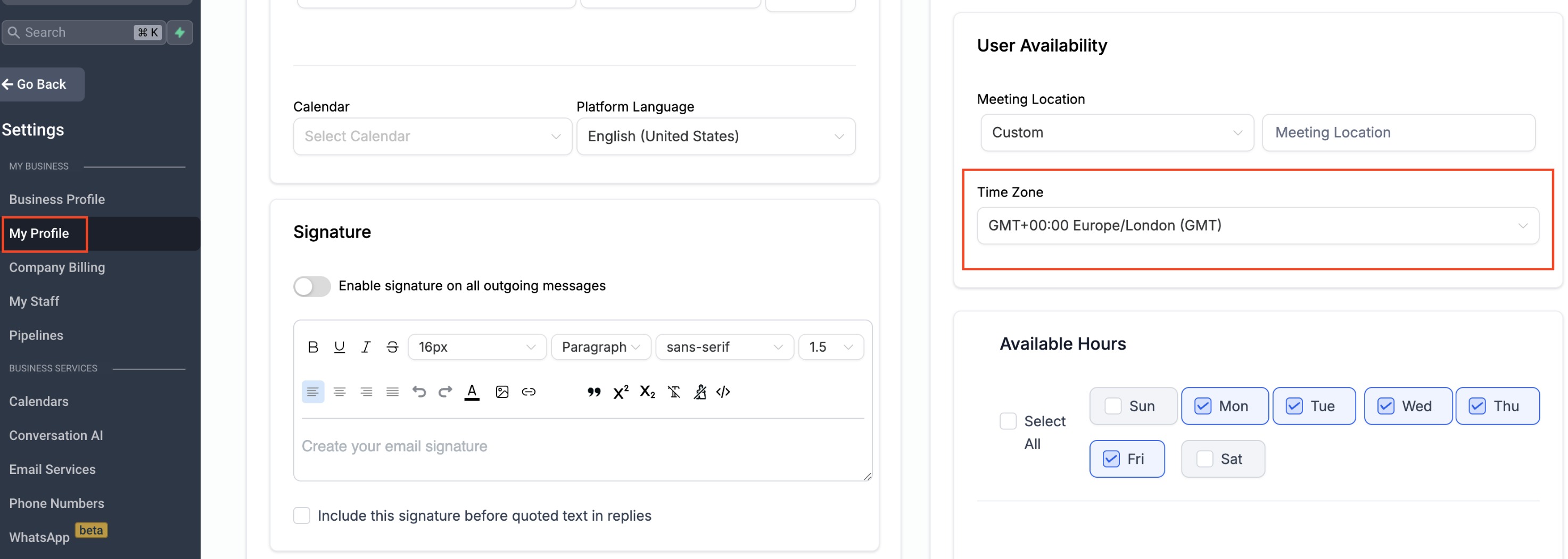 - Manually adjust your availability to match the selected timezone. For example, if your current location is in the UK (GMT +00:00), but you want to operate in New York (GMT -05:00), ensure to adjust your availability accordingly to align with the New York timezone.
