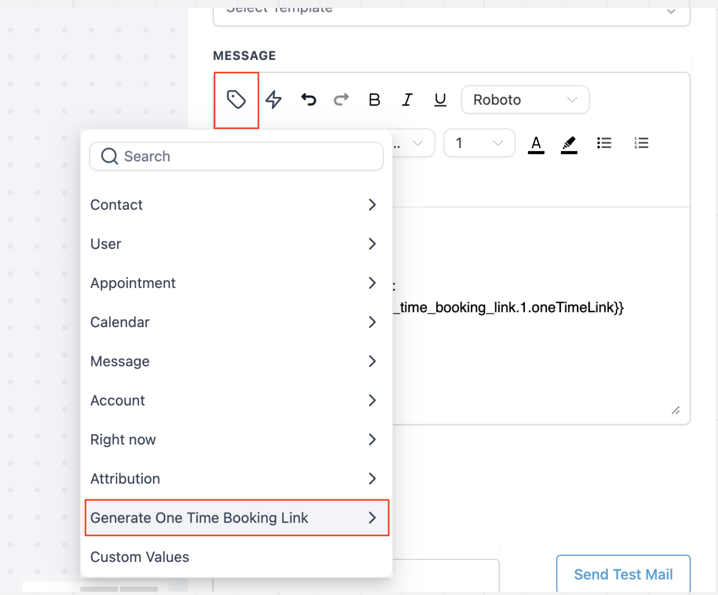 5. Add the Custom Value: Insert the unique one-time link that will get generated each time a trigger is activated, into the email body using a custom value. Select 'Generate One Time Booking Link' and choose 'One Time Link.'