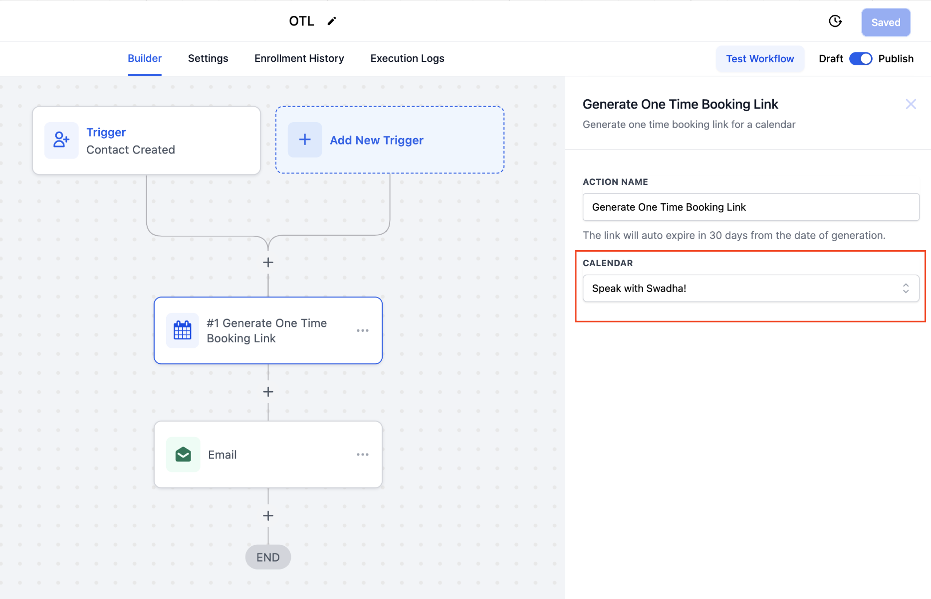 A one-time link is a unique scheduling link that automatically expires upon booking. With the 'Generate One-Time Booking Link' action, users can now effortlessly create these links directly within their workflow.