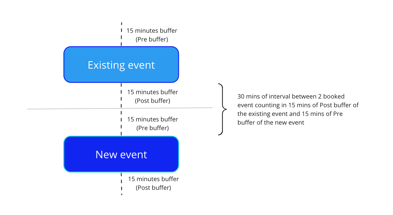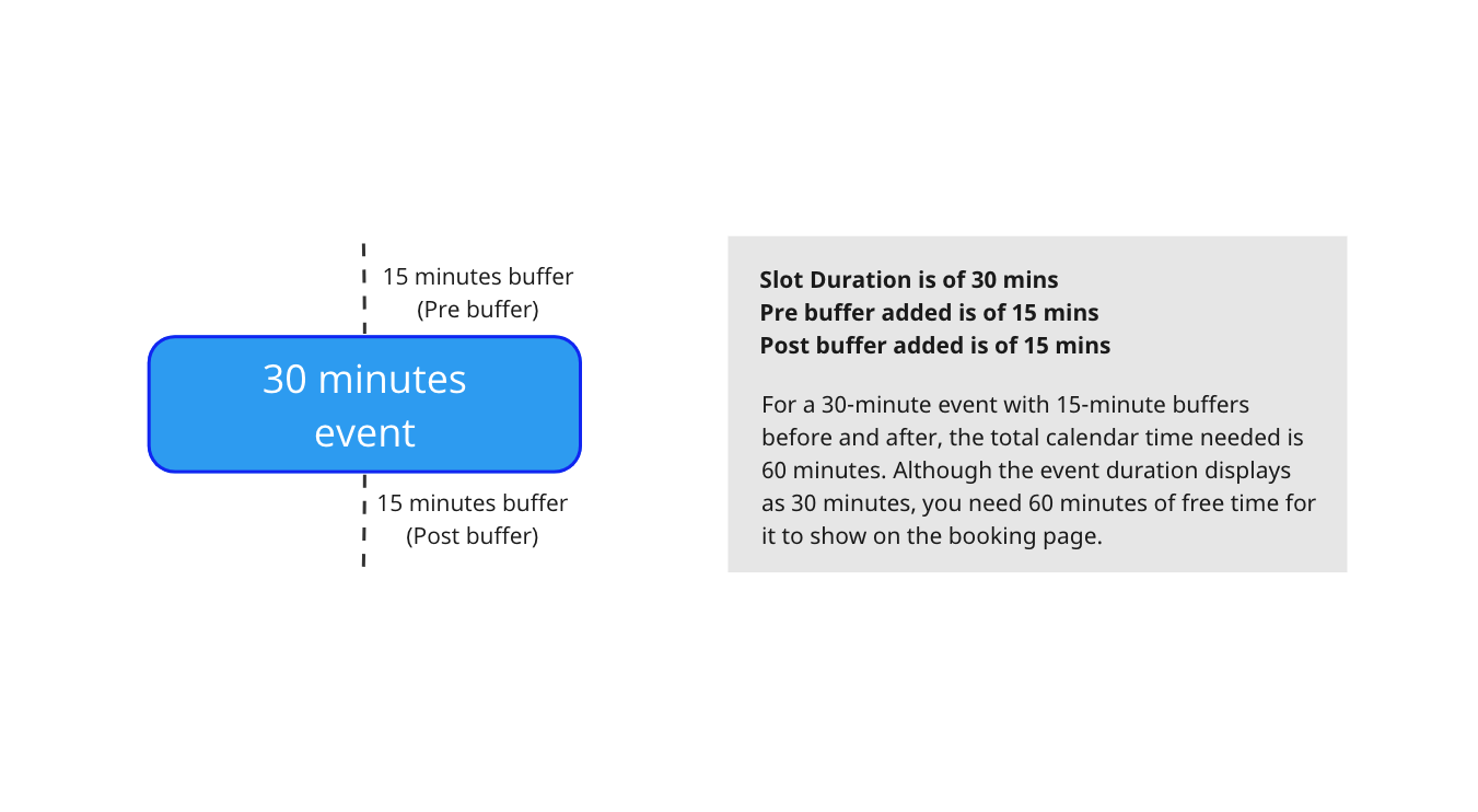 Using the example above, if there's a 30-minute event with 15-minute buffers before and after, someone else booking on the same day will see an available slot 30 minutes after the existing booking.