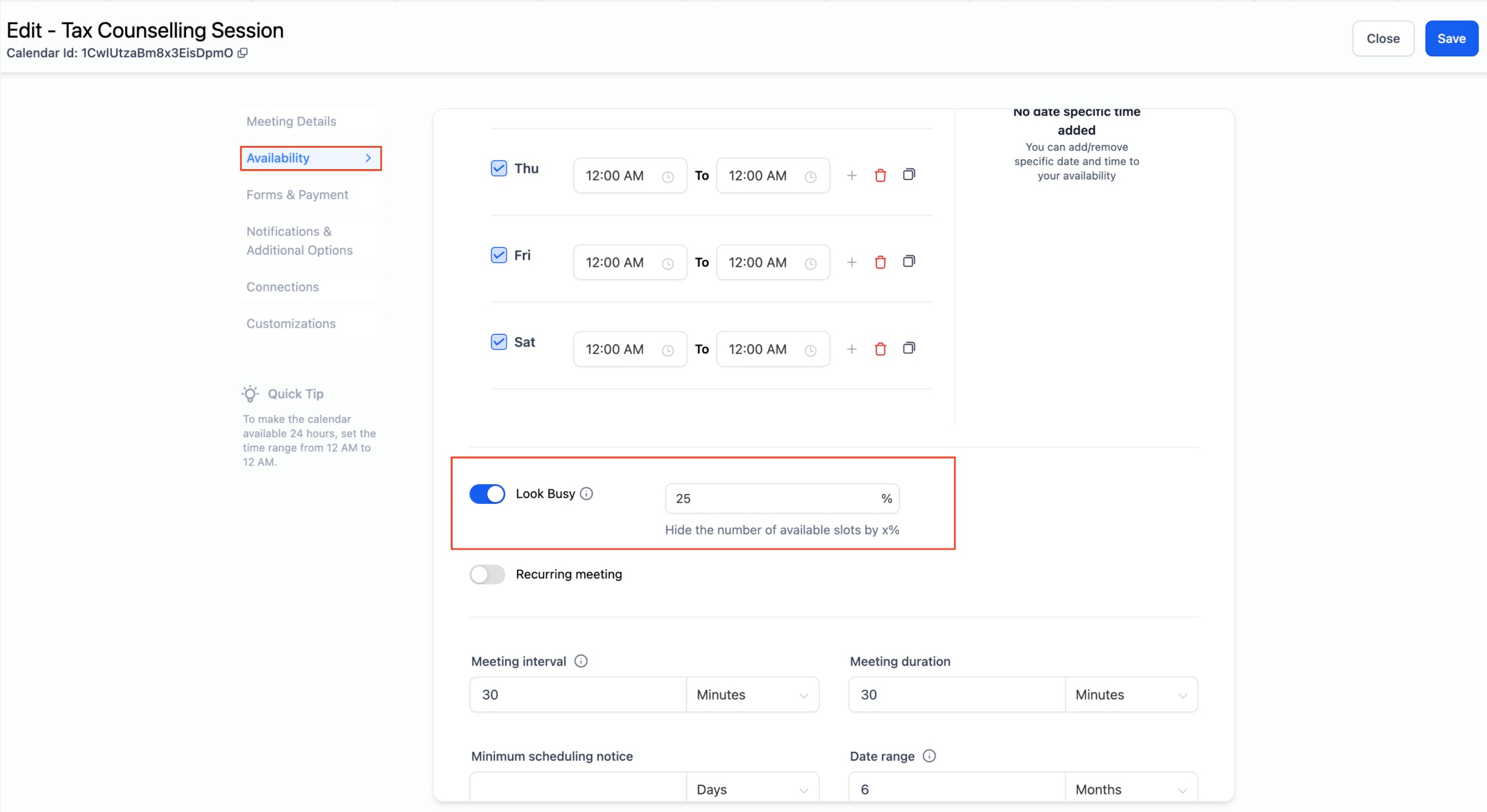 - Recurring Appointments: For recurring appointments, a slot may appear hidden due to the "Look Busy" setting on future dates, but it will still be booked based on the first slot's date and time and the recurrence settings.
