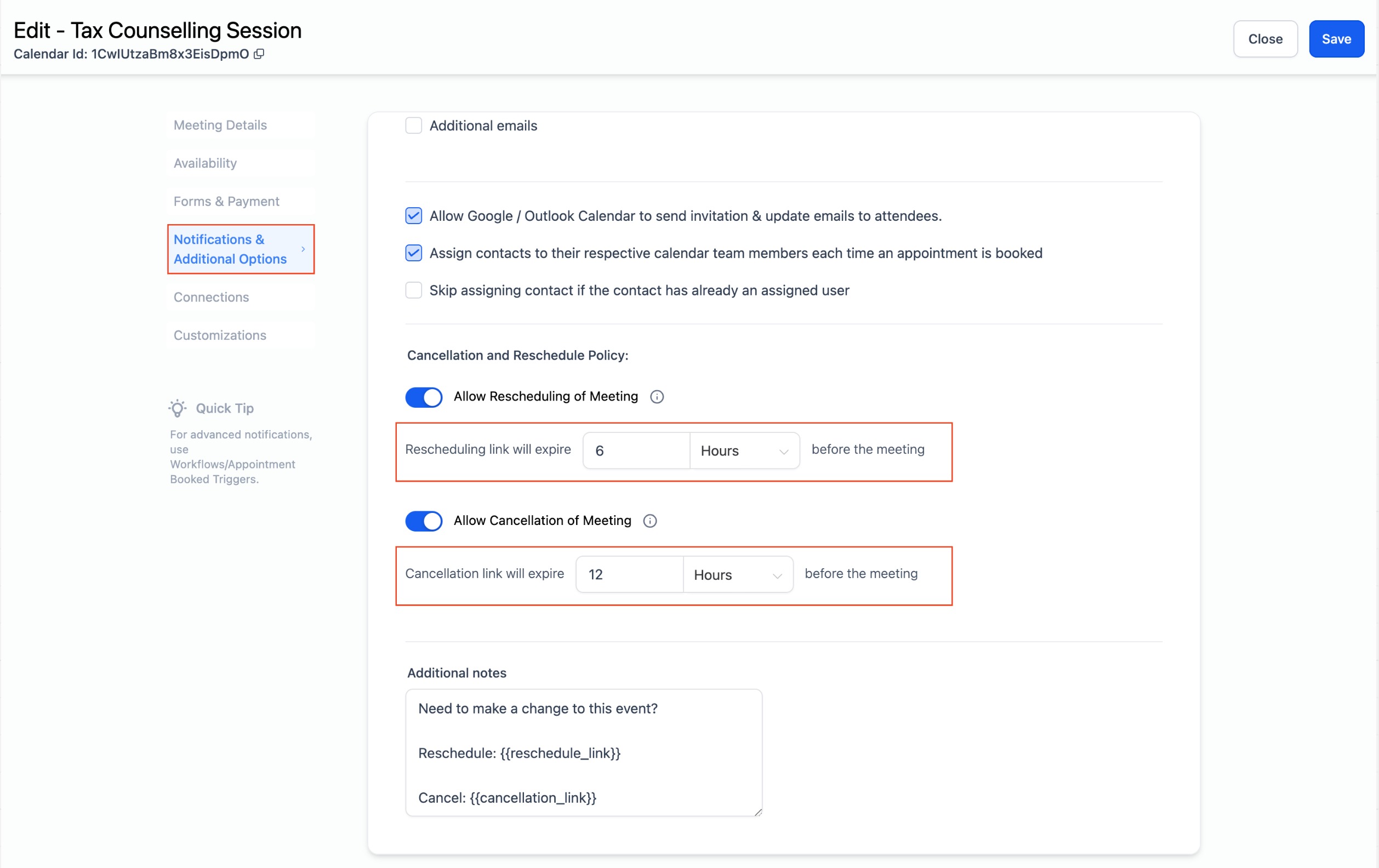 When you toggle on "Allow Cancellation" and "Allow Reschedule", these links are added to the additional notes section. The content in this section is then included in the calendar invite in the notes section. Bookers can use those links to cancel or reschedule their appointments accordingly.