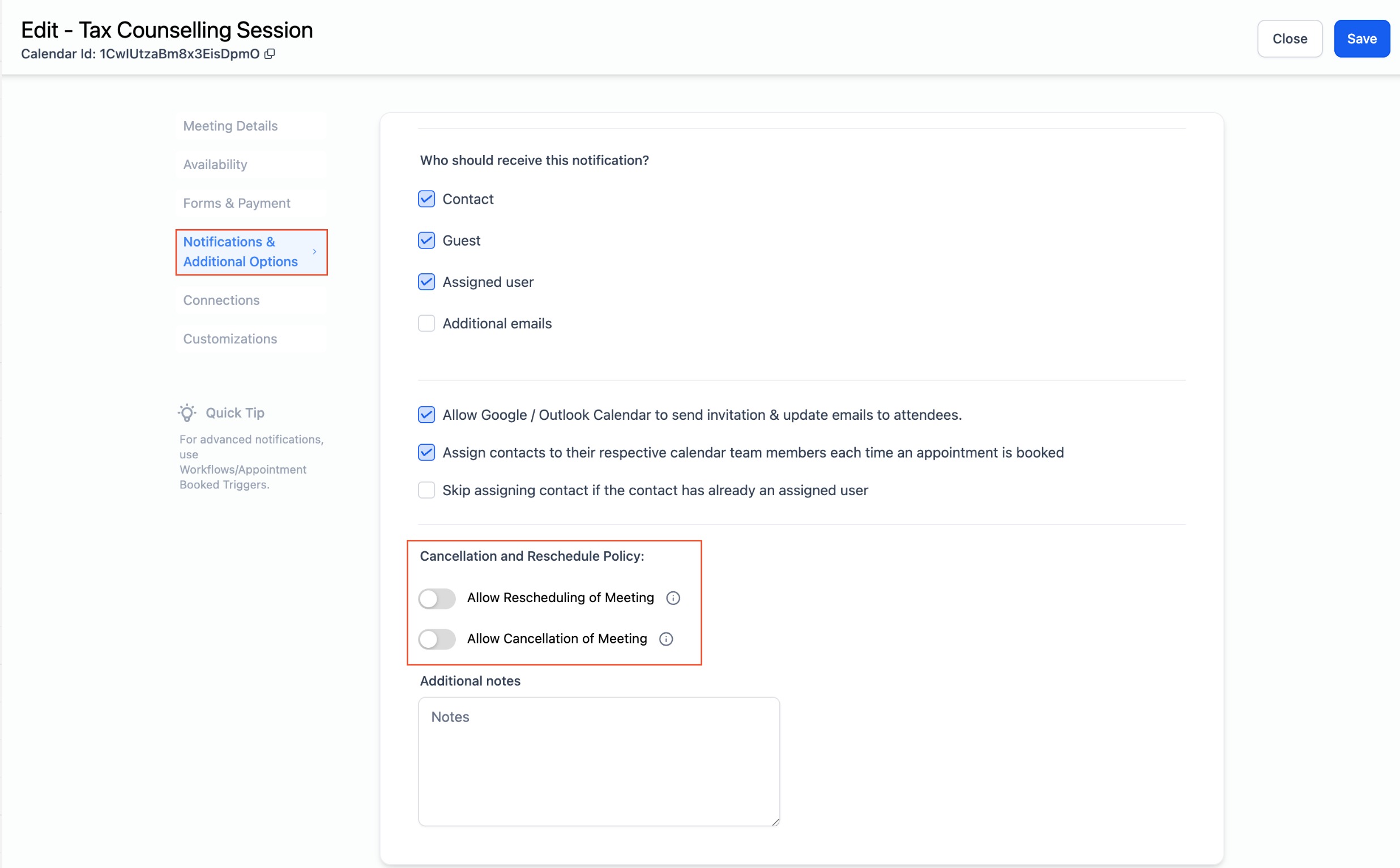 - Under Cancellation and Reschedule Policy, turn on "Allow Cancellation of Meeting" and "Allow Rescheduling of Meeting".