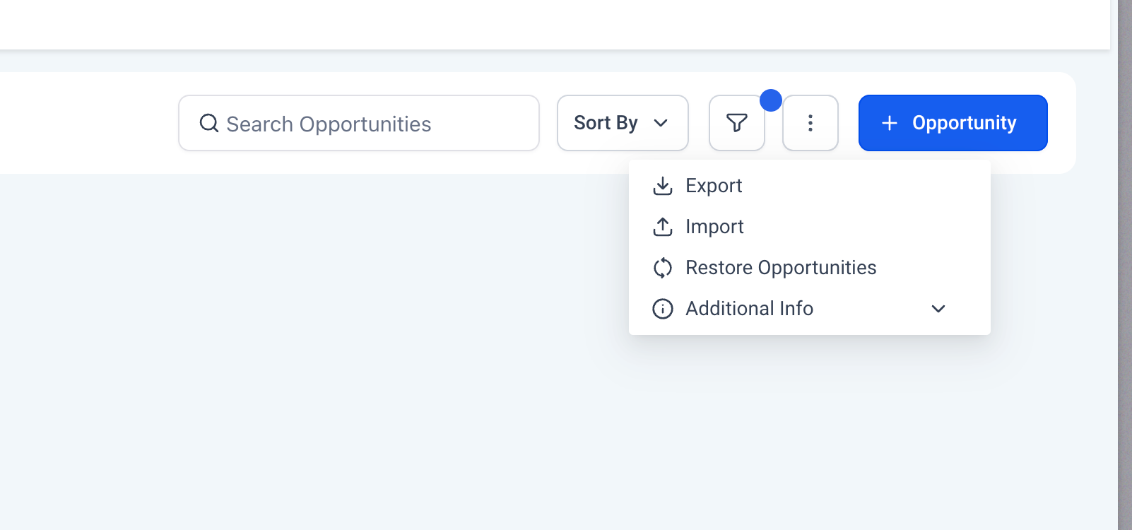 - On the top right under 3 dots, click on "Import Opportunities"