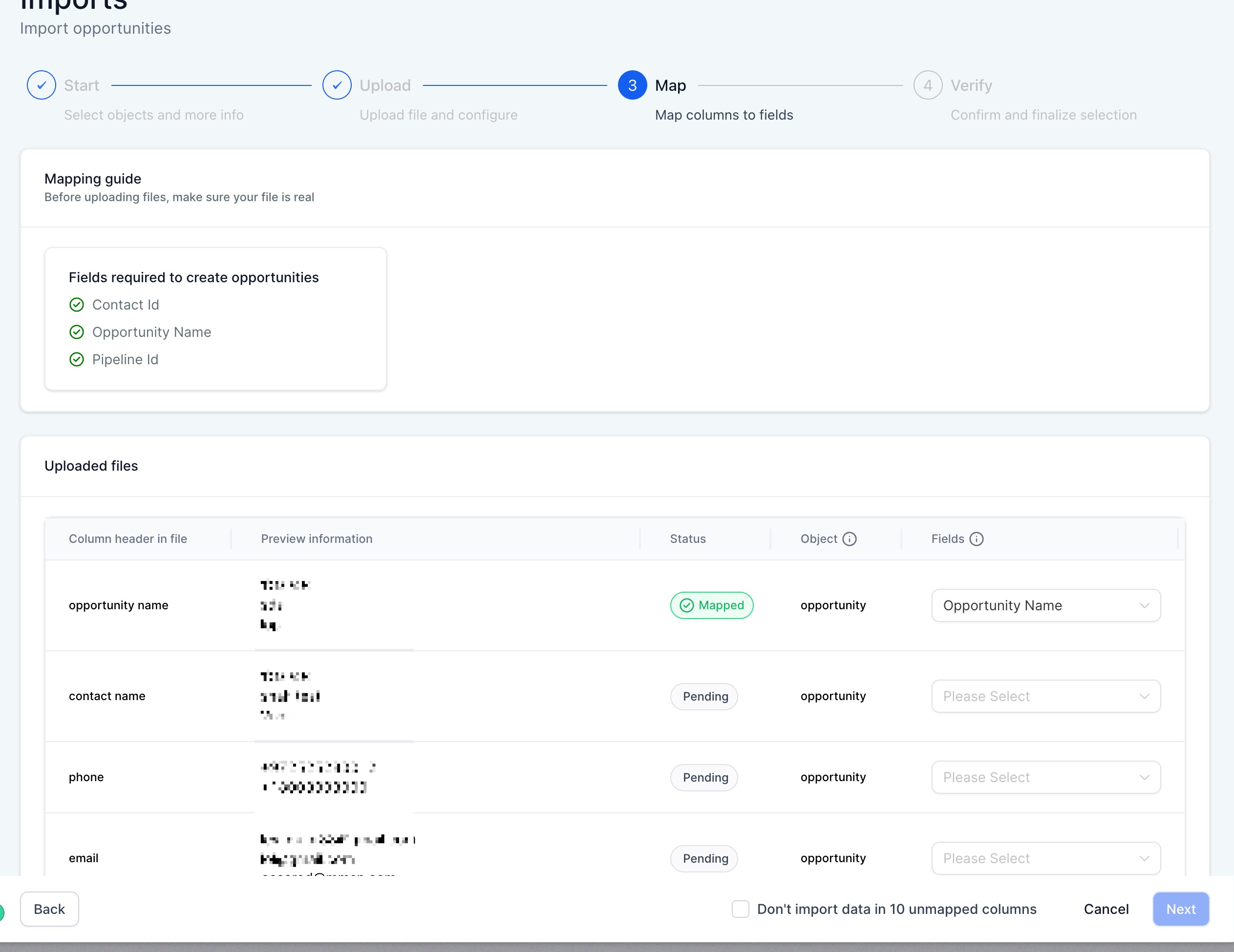 - If you decide to not import certain field, you can choose to keep it unmapped and check the box on the bottom to proceed. -"Please ensure all mandatory fields are mapped. To proceed, either map all fields or choose Don't import data for unmapped columns"