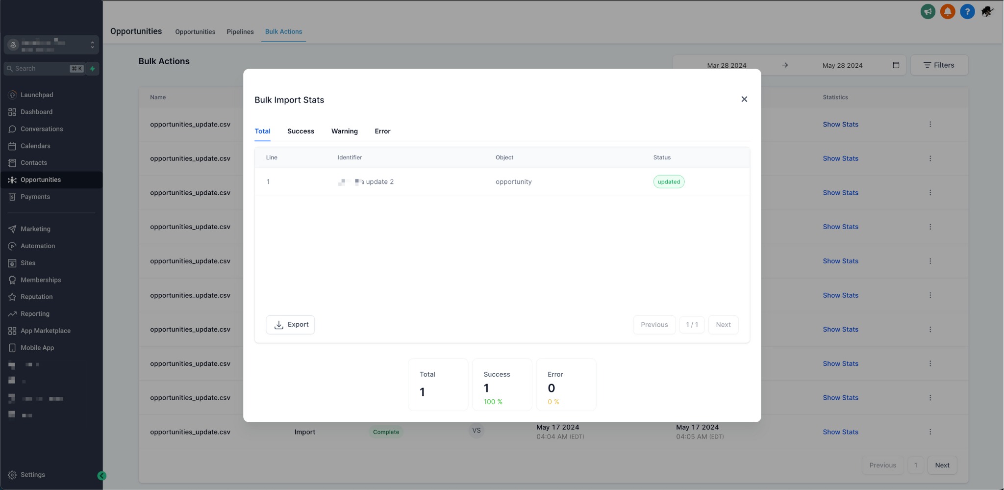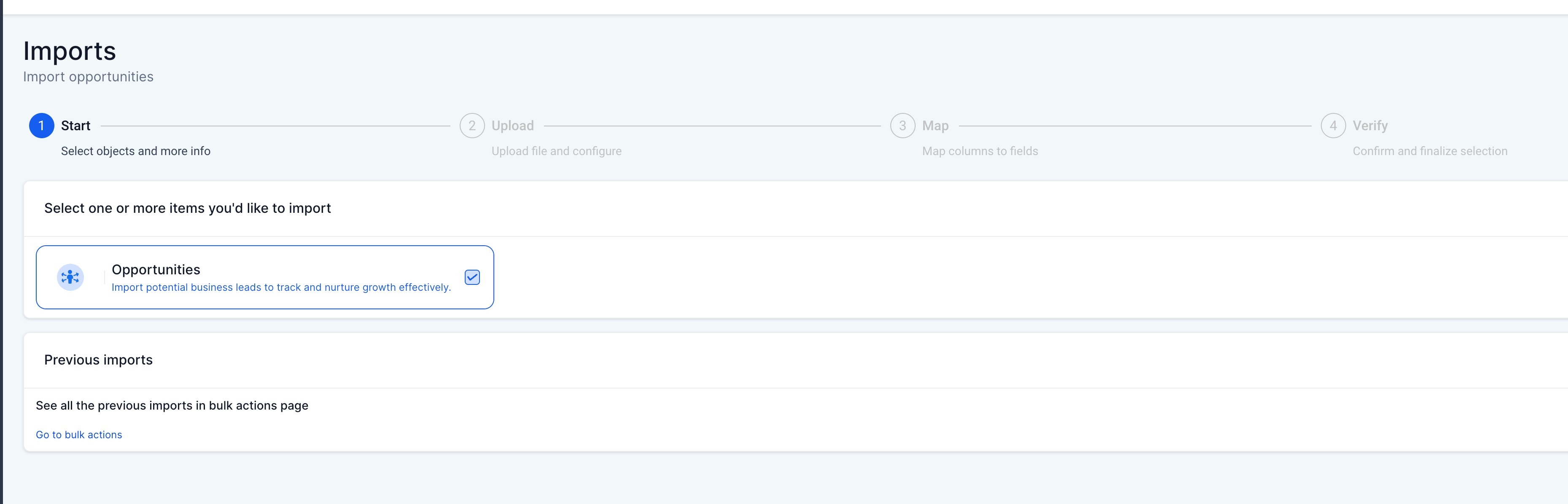 7. Monitor the Import: Check the import progress under Opportunities > Bulk Actions. If any errors occur, refer to the error messages provided for guidance on fixing them.