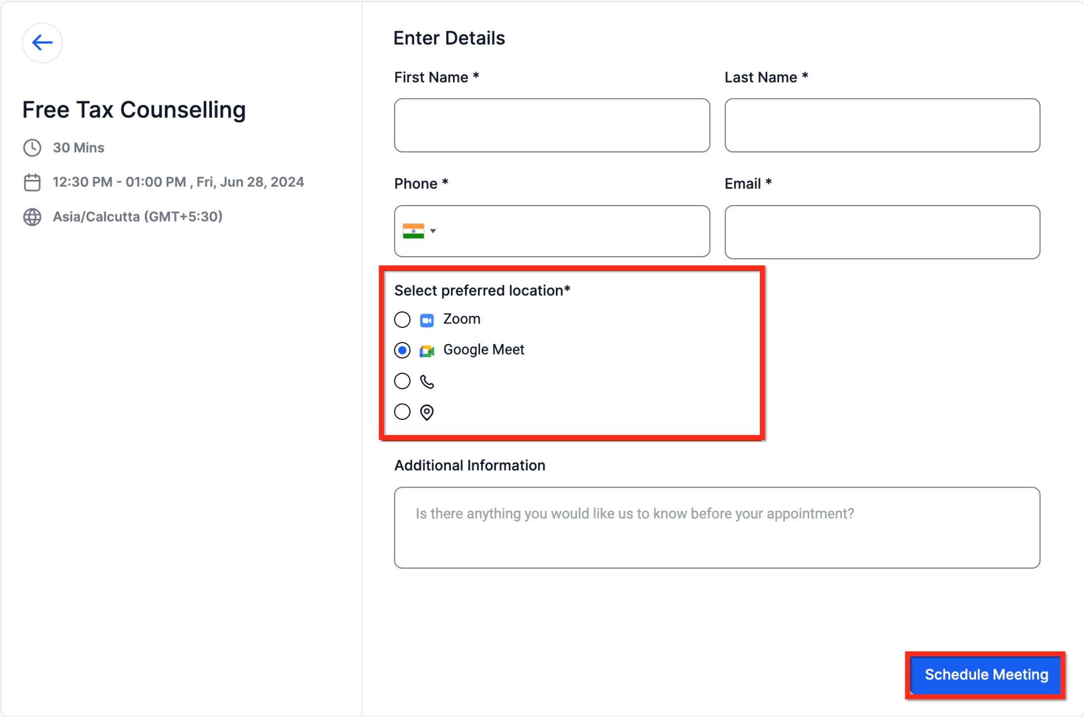 All configured meeting locations appear directly on the booking page. The booker simply selects the option that works best for them before confirming the appointment.