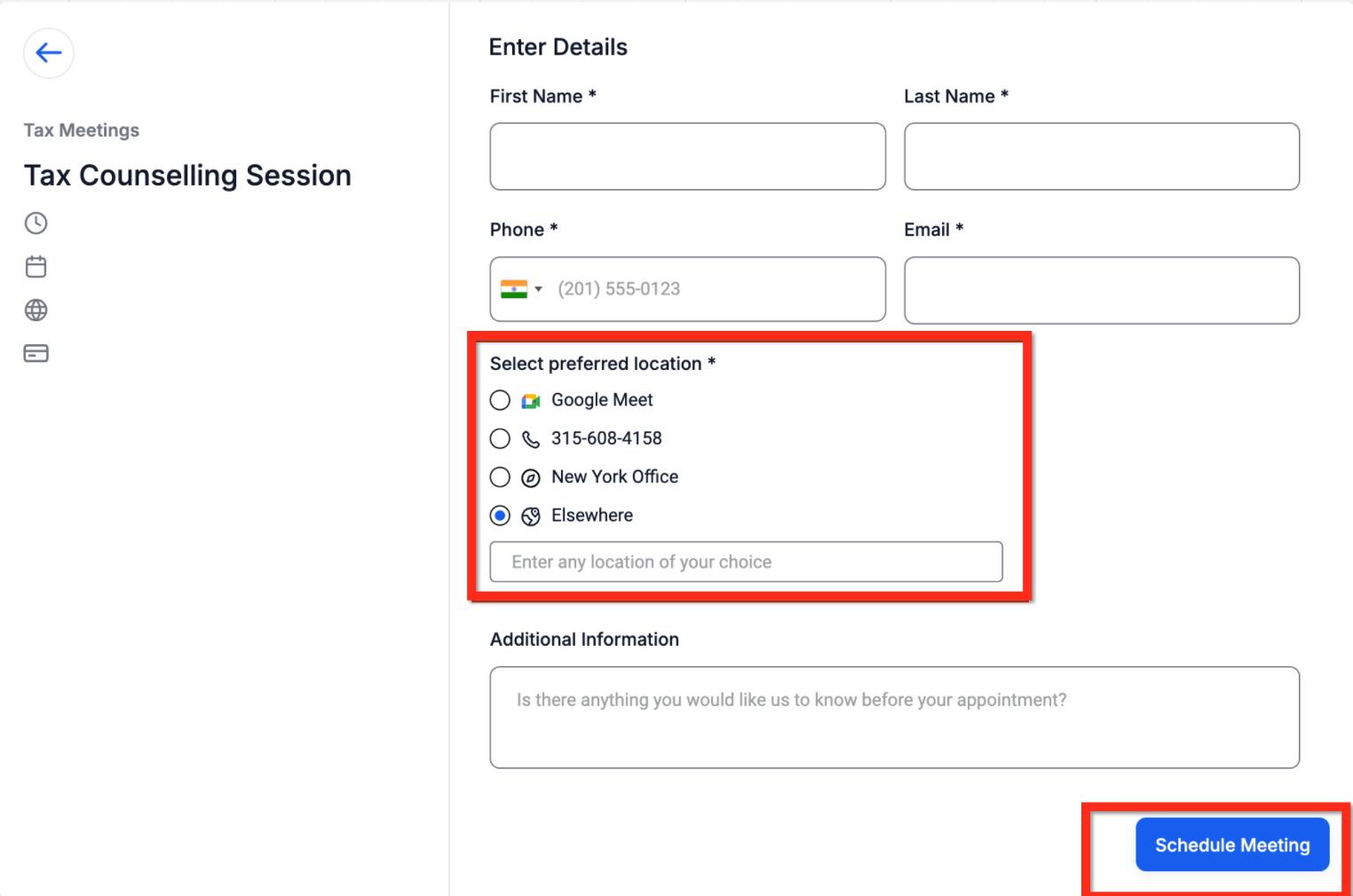 Phone meetings use a predefined phone number that can be edited if needed. Address-based meetings use a physical location such as an office or storefront. Custom locations allow you to enter any value, such as special instructions or a static meeting link. You can also choose to ask the booker to enter their preferred location, which is useful for flexible or on-site meetings.