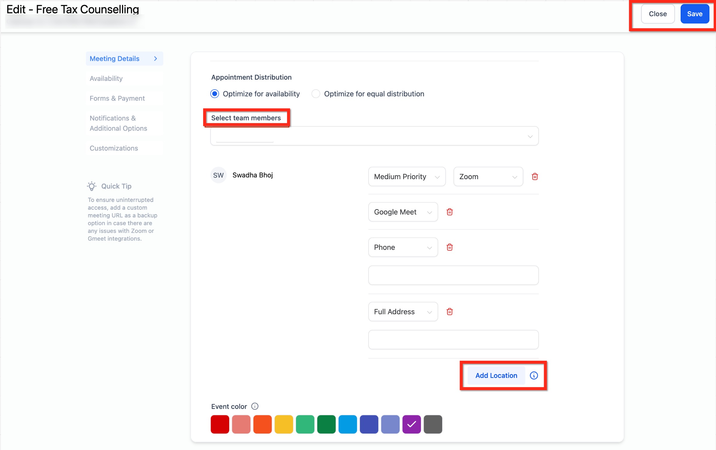 For calendars that involve team members, meeting locations can be assigned per person. This ensures that each team member uses the correct meeting method for their availability and role.