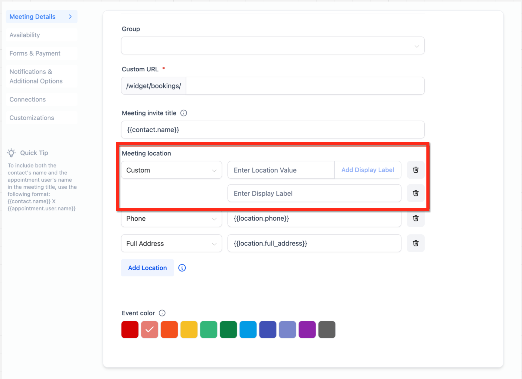 When using a custom location, you may add a display label so the booking screen shows a friendly name while keeping the full details hidden until the meeting is confirmed.