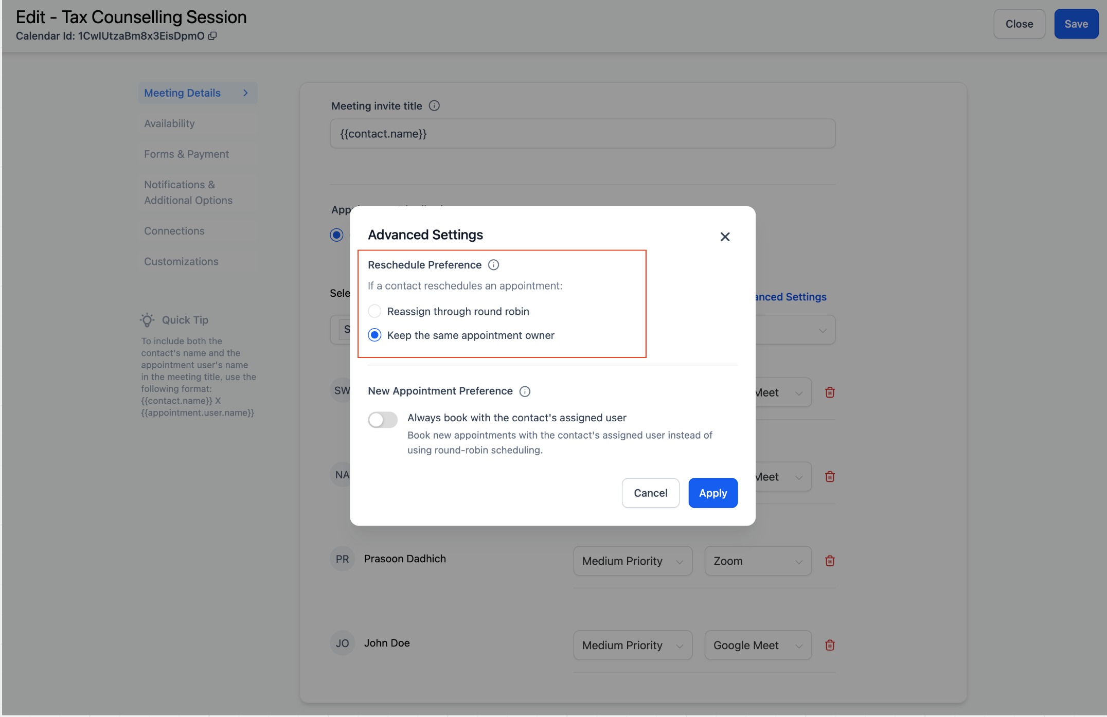 Reschedule Preference: Choose who the appointment should be assigned to when a contact reschedules using the booking widget.