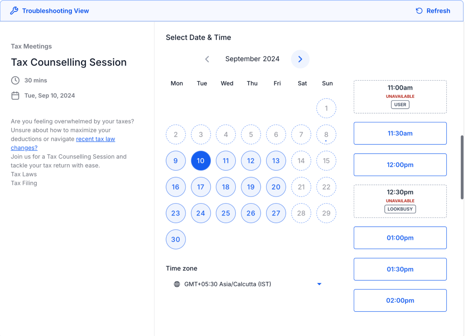 The Troubleshooting Tool is designed to help users identify why specific calendar slots are unavailable in the booking widget. By providing detailed insights into slot availability, users can easily understand the reasons behind unavailable slots and take corrective action if needed.