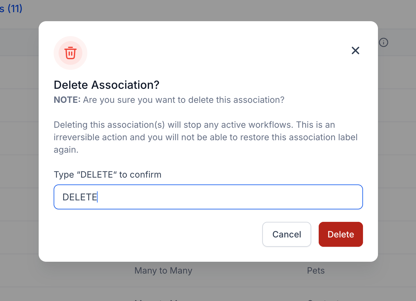 - Note that the delete action can only be performed if there are no existing relations between two different records using the mentioned label.