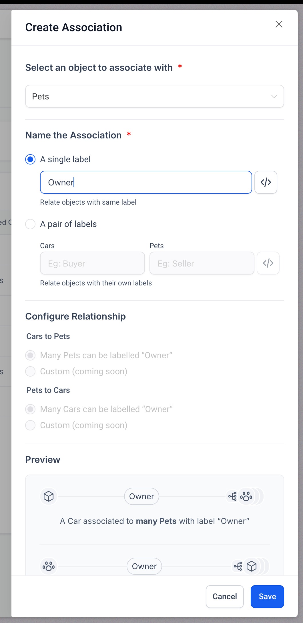 - Example: For associating a car with its owner, you might set the labels as “Owner” and “Car."