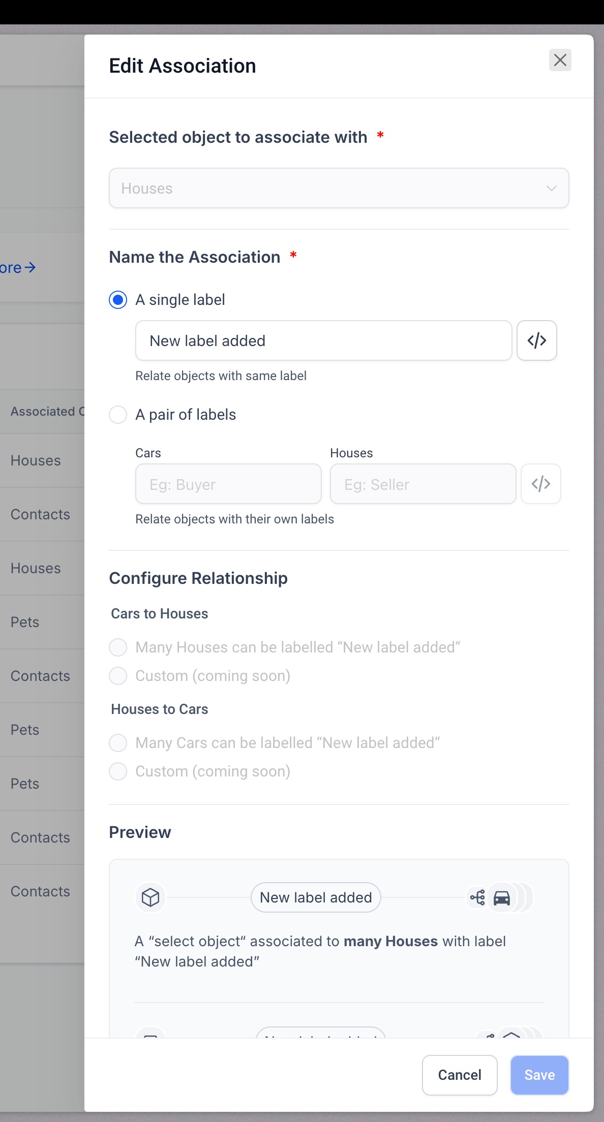 - You can now use these labels to associate records in your custom objects or between a custom object and a contact.
