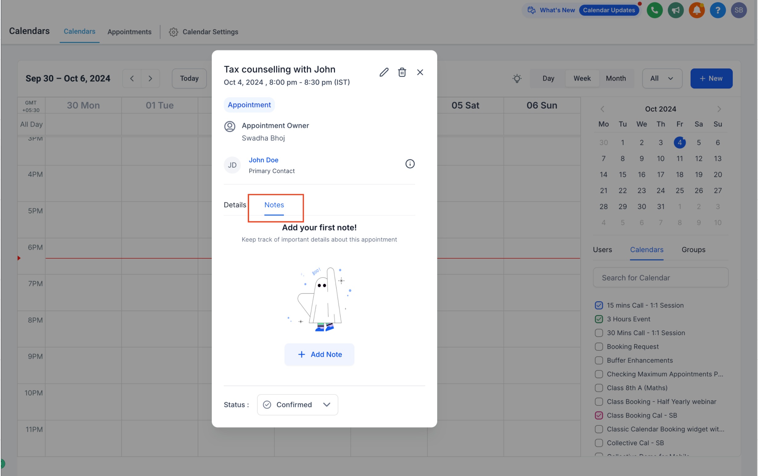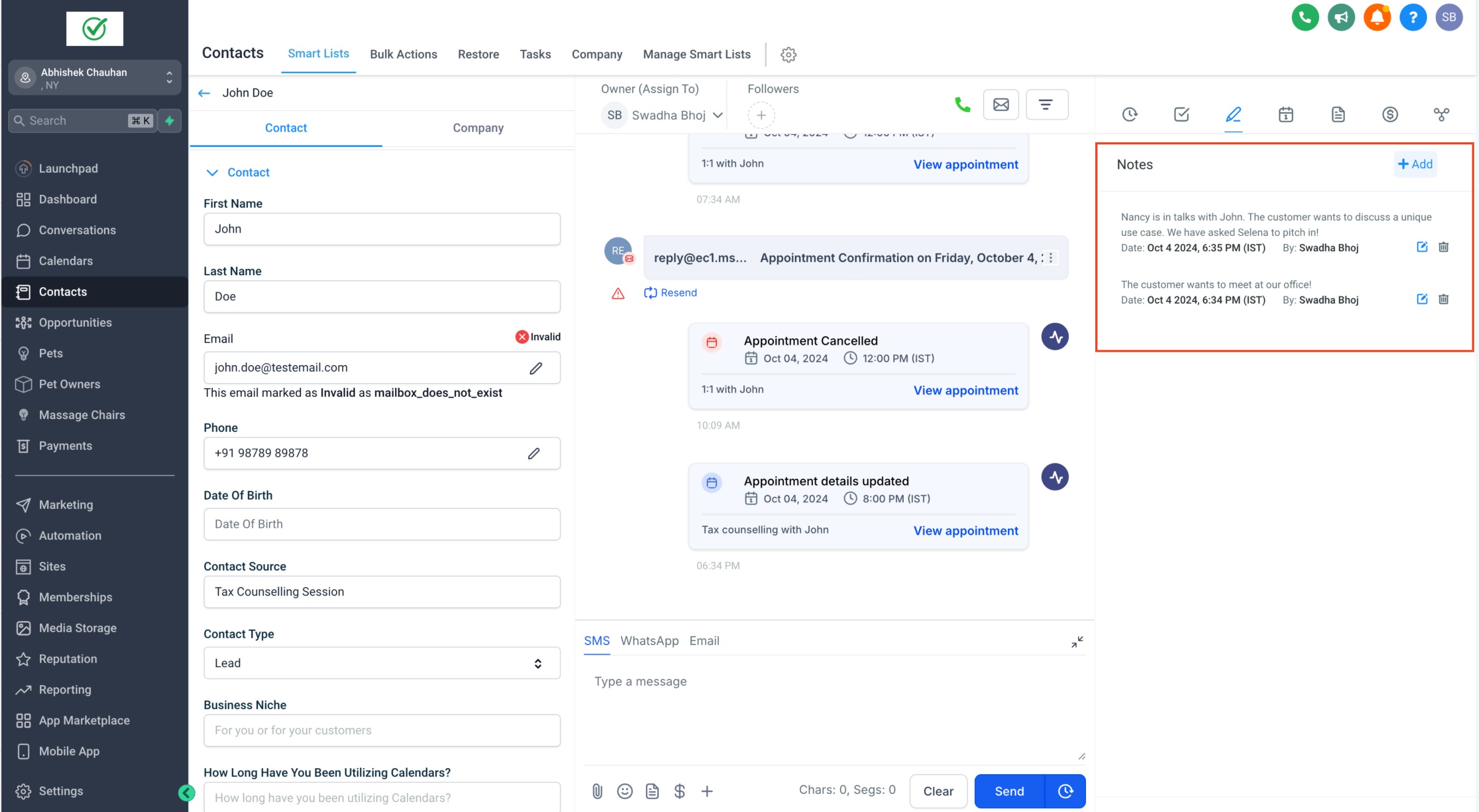 You can now add and track notes for individual appointments. All notes related to an appointment are visible in the Appointment Modal, where you can see notes added by various users. Additionally, these notes are accessible in the Contacts & Conversations tab under the Notes section, helping you keep a detailed history of interactions for each appointment.