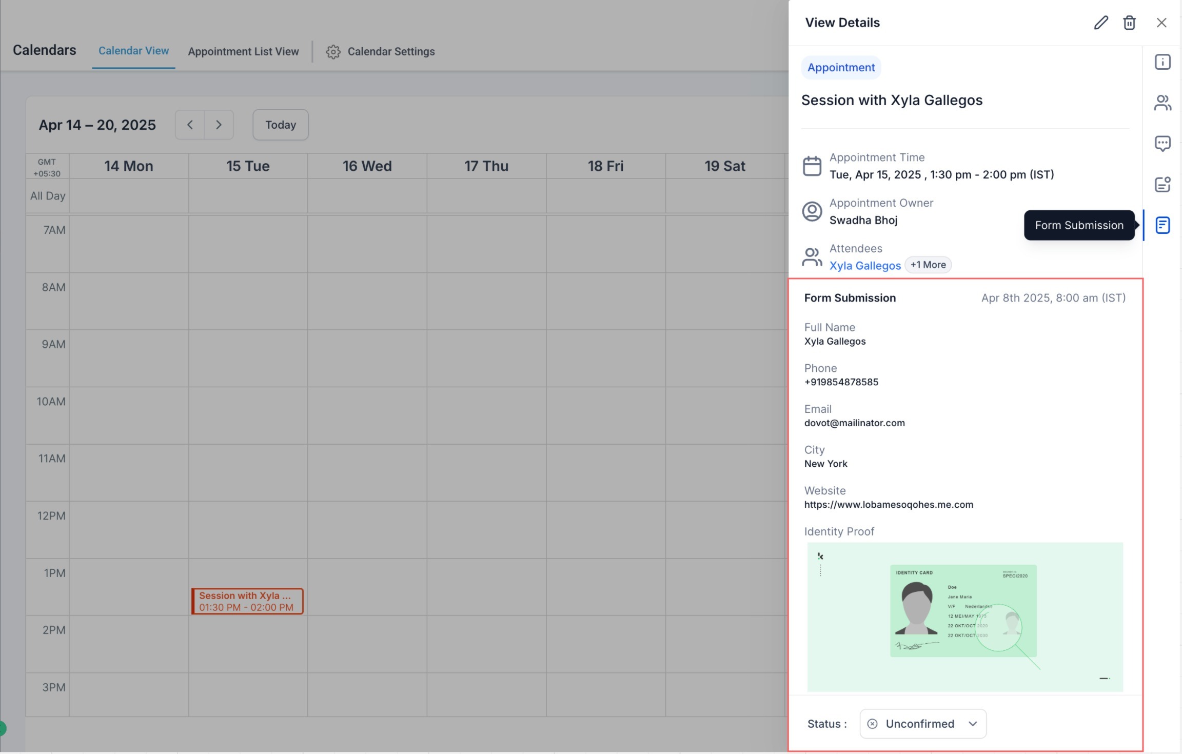 The View Form Submissions feature allows users to see responses from custom booking forms directly within the Appointment Modal. This eliminates the need to navigate to the Forms module or Contacts to review details, making your scheduling workflow faster and more seamless.