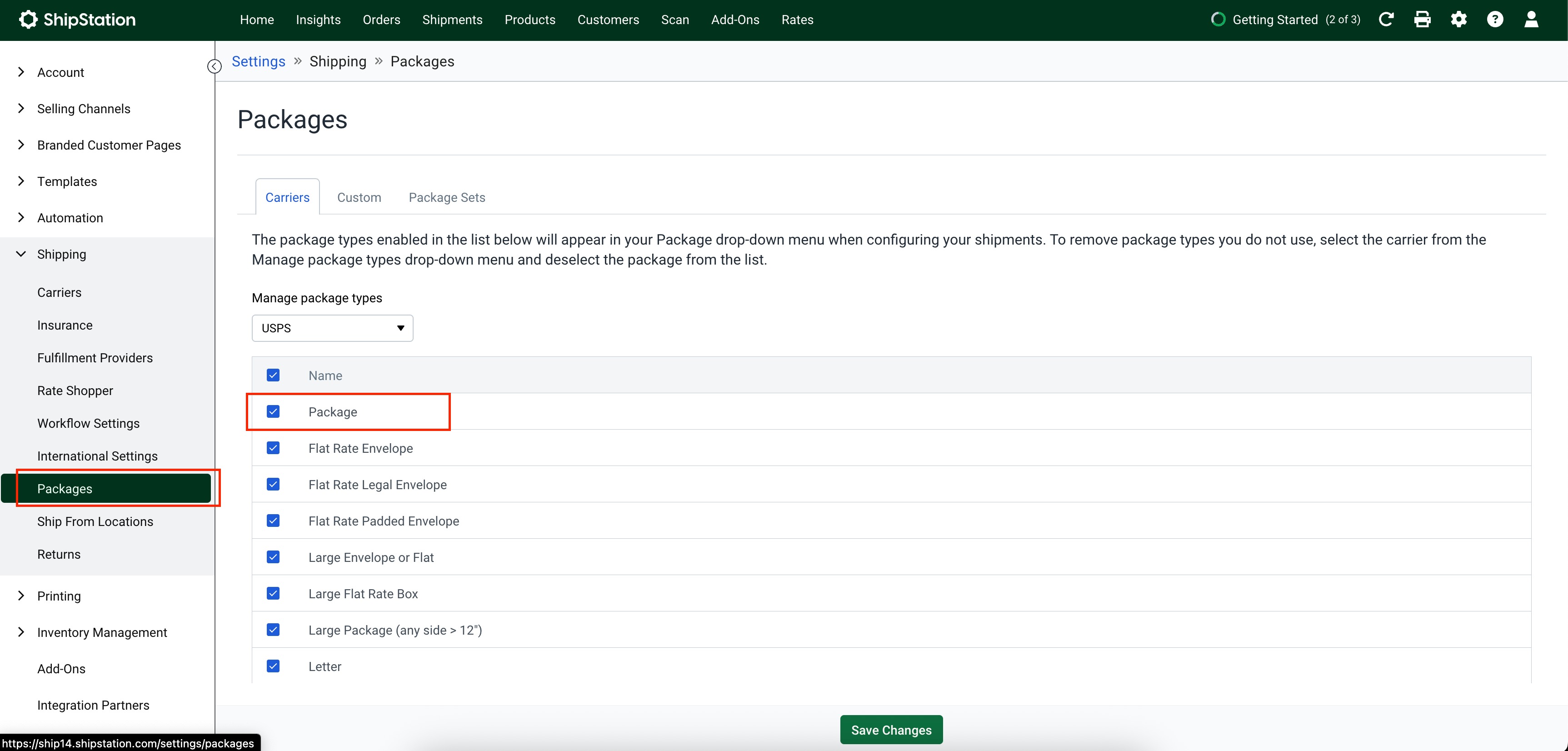 Review the list of packages and ensure the ‘Package’ option is enabled for all active carriers you plan to use.