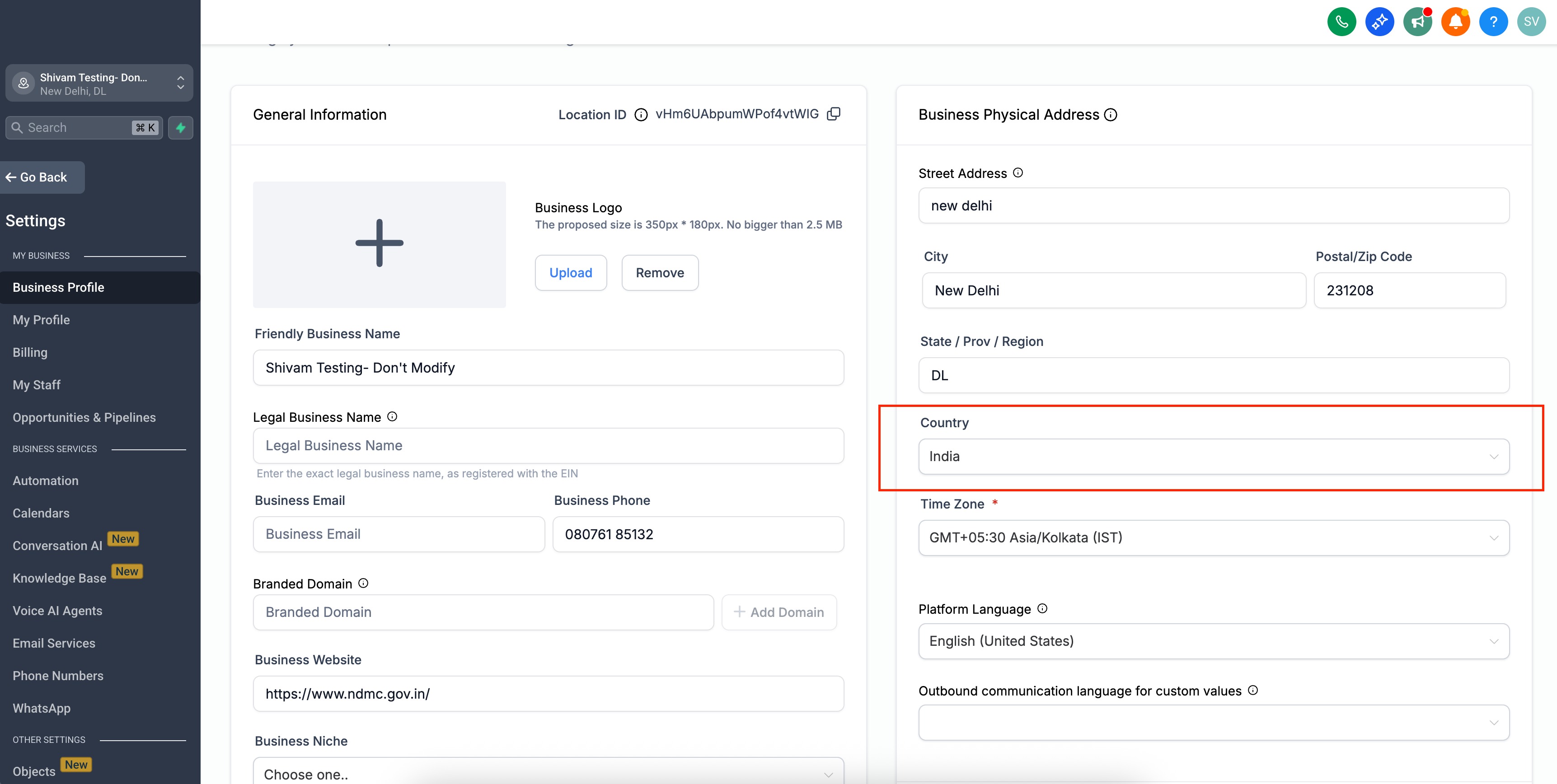 Go to Settings > Business Profile > Business Physical Address > Select Country